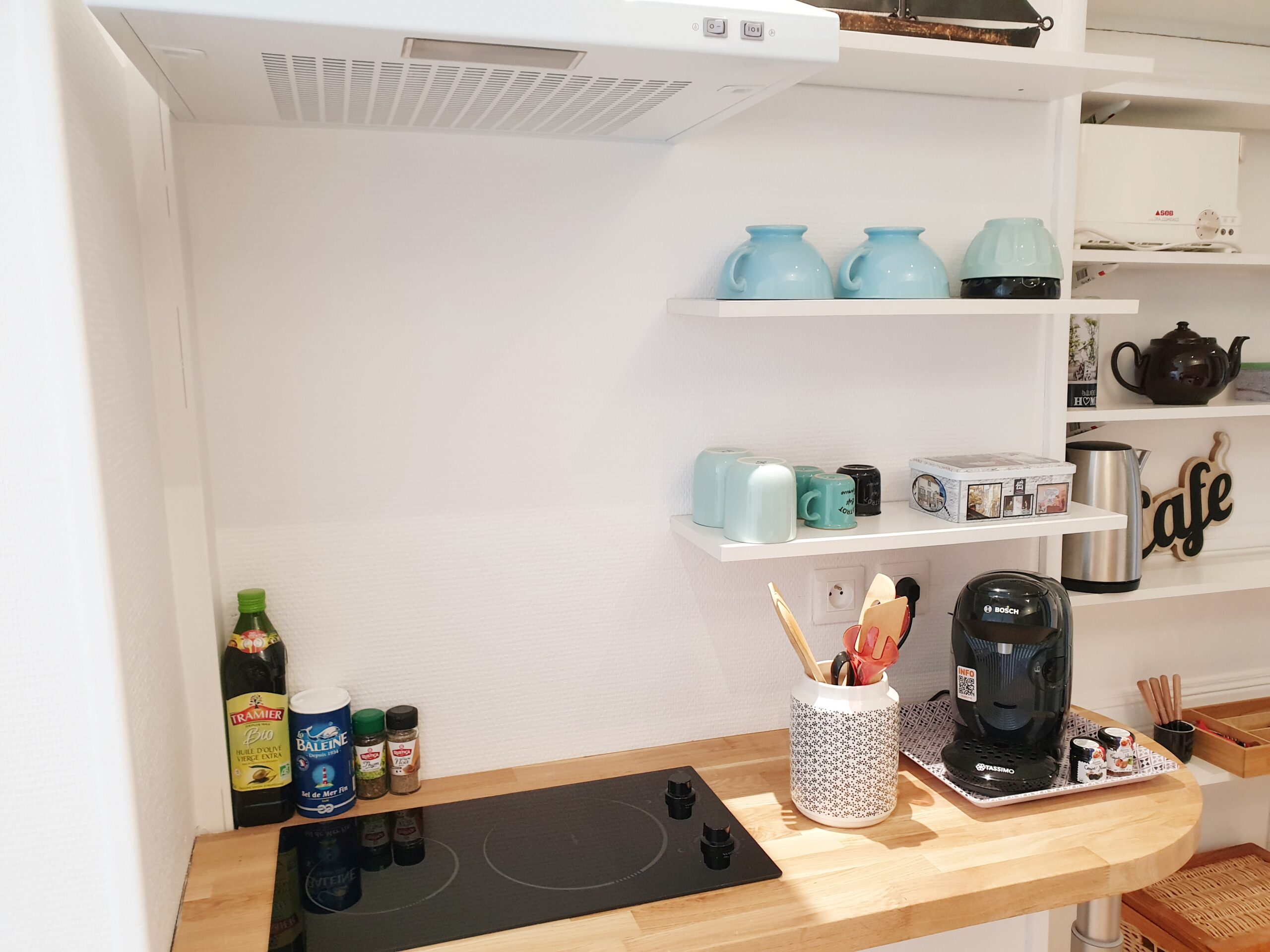 Sa cuisine entièrement équipée avec four/micro ondes combiné, machine à café KRUPS, bouilloire, grill pain et plaques de cuisson et ouverte sur le salon, vous laissera la possibilité de préparer de bons petits plats locaux grâce aux halles du marché couvert situé à 700 mètres.