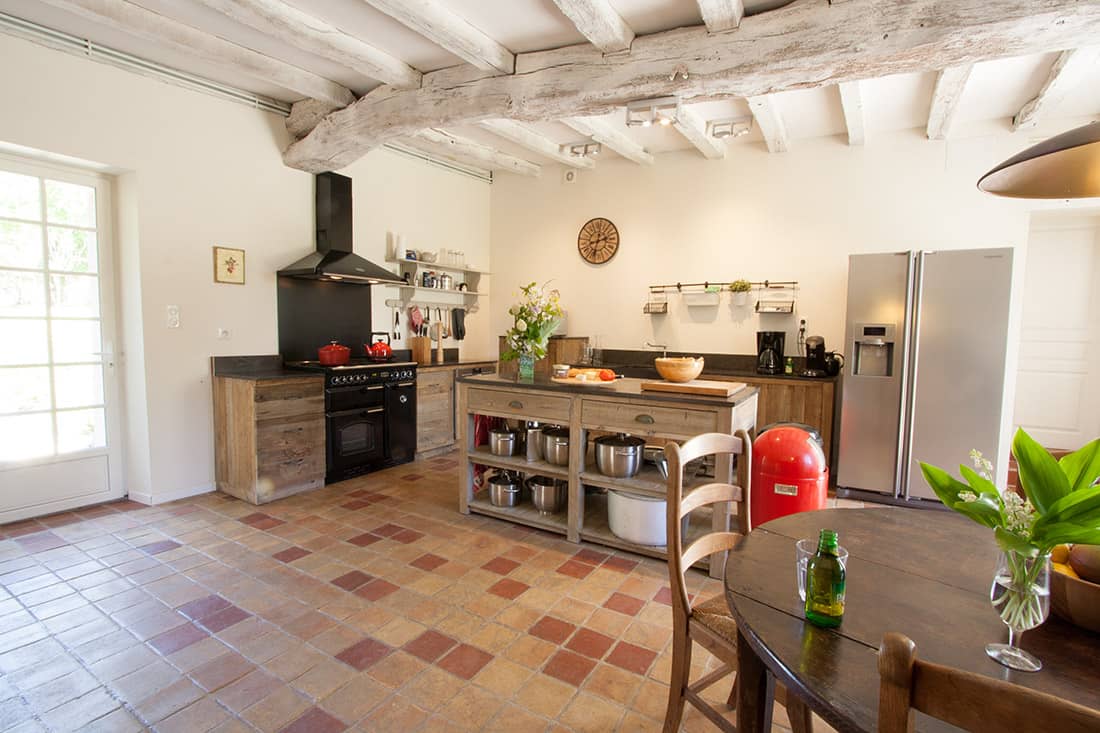 Cuisine ouverte, connexion directe avec salle à manger, design rustique, réfrigérateur américain avec congélateur et machine à glaçons, cuisinière Falcon avec 5 feux, lave-vaisselle, micro-ondes…).
